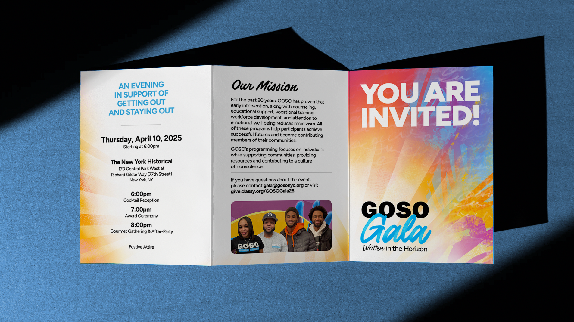 We developed the visual identity for GOSO’s 2025 Gala, a key fundraising event for the NYC nonprofit dedicated to reducing recidivism through education, employment, and emotional well-being. We developed the theme, "Written in the Horizon," as a symbol for a bright future and the power of manifesting new beginnings.