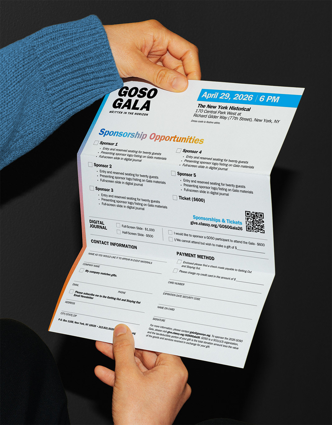 GOSO (Getting Out and Staying Out) is a NYC nonprofit dedicated to reducing recidivism through education, employment, and emotional well-being. Their annual gala is their largest fundraising event, and from 2024 through 2026, I led the visual identity from concept to execution.